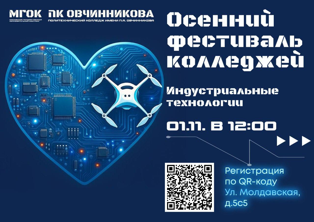 Приглашаем вас стать частью Осеннего фестиваля колледжей в МГОК! Наш проект «ТехноЛаб» открывает свои двери для каждого! У вас будет уникальная возможность не только познакомиться с современными направлениями обучения, но и на практике проверить свои силы и узнать, как работают перспективные технологии. Ждем вас 01 ноября 2025 года в 12:00 по адресу: г. Москва, ул. Молдавская, 5с5.